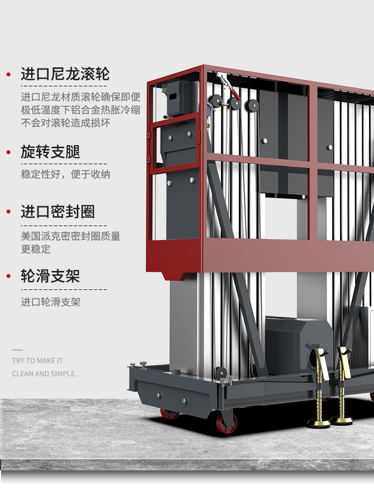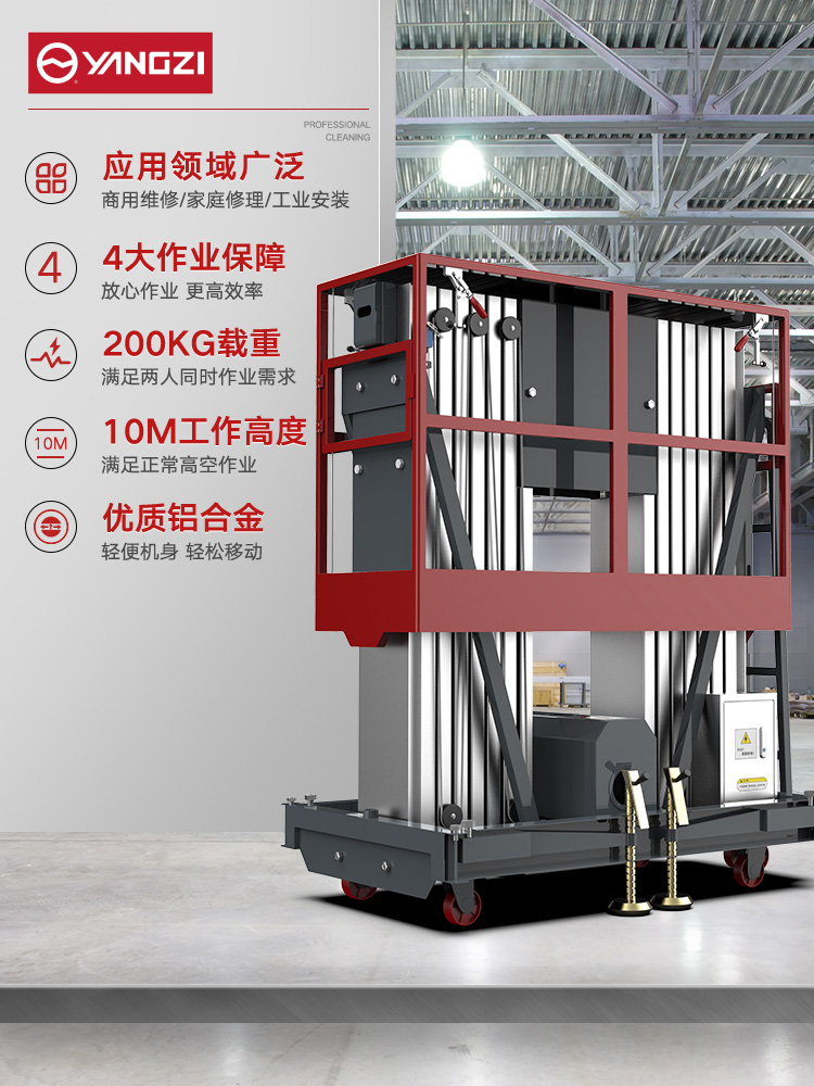 揚子升降平臺YZ-DS2:應用廣泛,4大作業保障設置,承載量打穩如磐石,可以輕松移動,緊急斷電防誤操作,雙控制臺,雙操作更安心更方便,還擁有防爆閥等優質選材