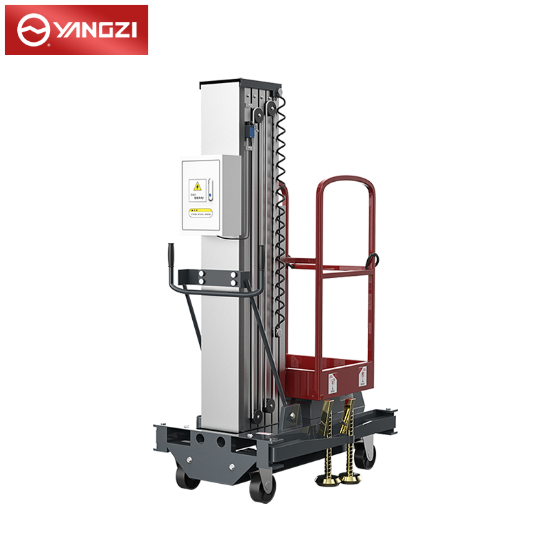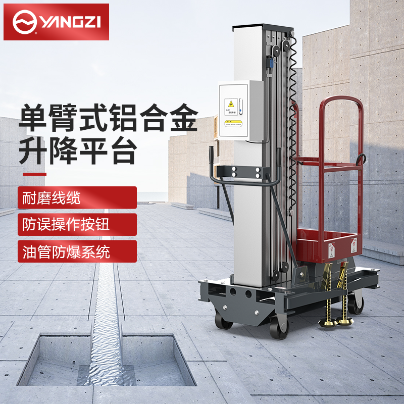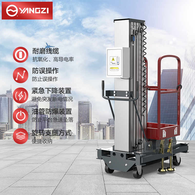 揚子平臺單柱鋁合金升降機YZDD:機身預留有叉車孔方便機器升降移動,更是能配合鏟車使用,人性化旋轉支腿,旋轉的支腿方式可以便捷收納機身更穩定。